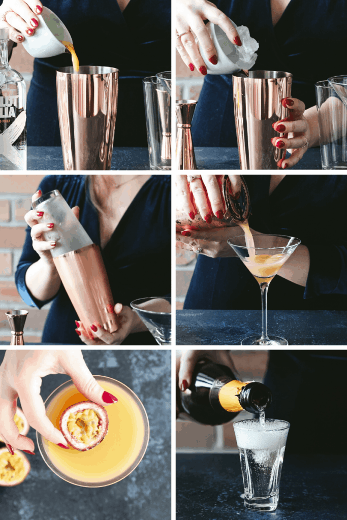 This recipe is simple and quick to make! Start by mixing all ingredients, excluding wine, in a cocktail shaker before pouring the mixture into a glass, topping it off with thin slices of passion fruit, and adding one Prosecco before serving your drink!